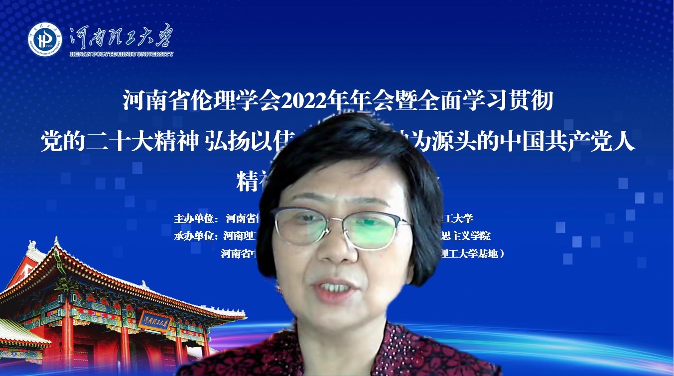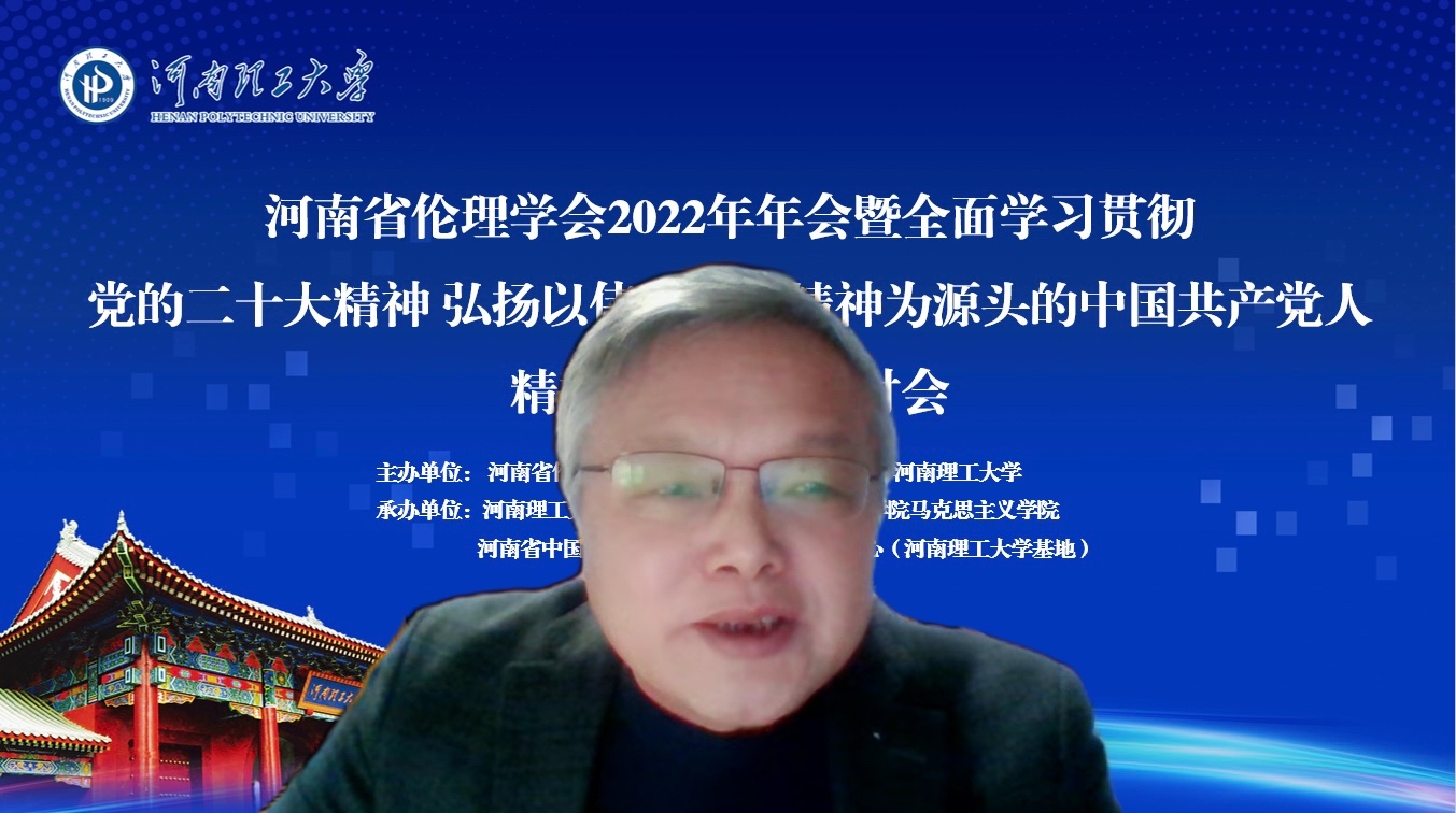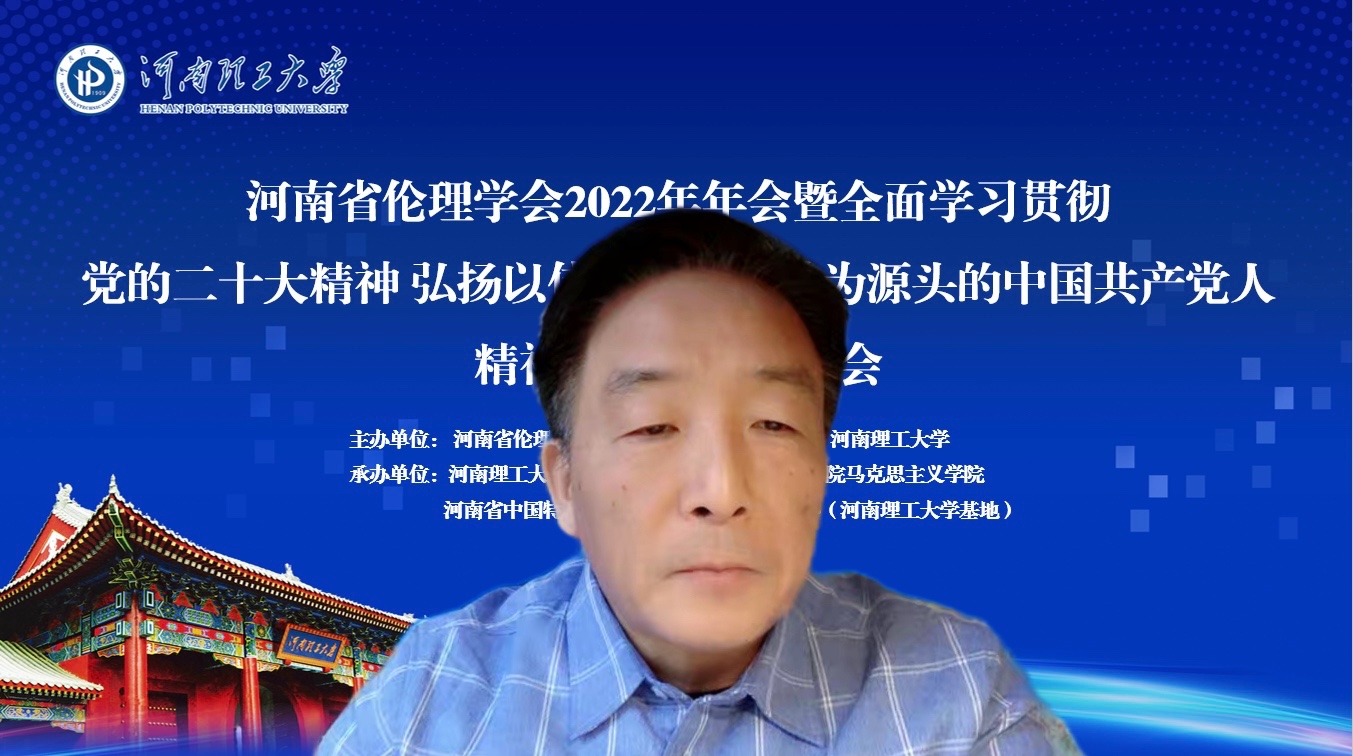 本网讯(记者 刘春德/文 李为群/图)在全国上下深入学习宣传贯彻党的二十大精神之际,12月17日,河南伦理学会2022年年会暨全面贯彻党的二十大精神、弘扬以伟大建党精神为源头的中国共产党人精神谱系学术研讨会,以线上线下相结合的形式成功举行。会议由河南省伦理学会、《道德与文明》杂志社、河南理工大学主办,河南理工大学马克思主义学院、郑州工商学院马克思主义学院、河南省中国特色社会主义理论体系研究中心(河南理工大学基地)共同承办。