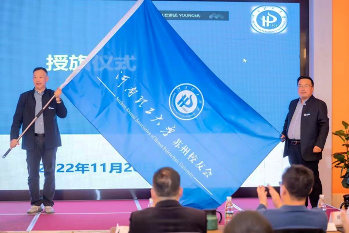 在与会校友、嘉宾热烈的掌声中,郭世旭从文海更手中接过了“河南理工大学苏州校友会”的大旗。郭世旭在履新发言中表示,从文海更会长手中接过苏州校友会的会旗,就意味着扛起了沉甸甸的责任,将与第二届理事会校友一起,团结带领苏州广大校友,充分发挥桥梁纽带作用,搭建交流平台,服务校友、服务母校,为母校建设国内一流特色高水平大学做出新的更大贡献。