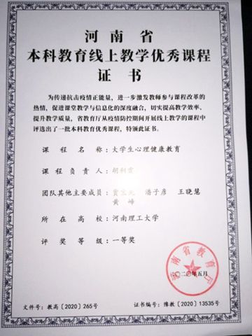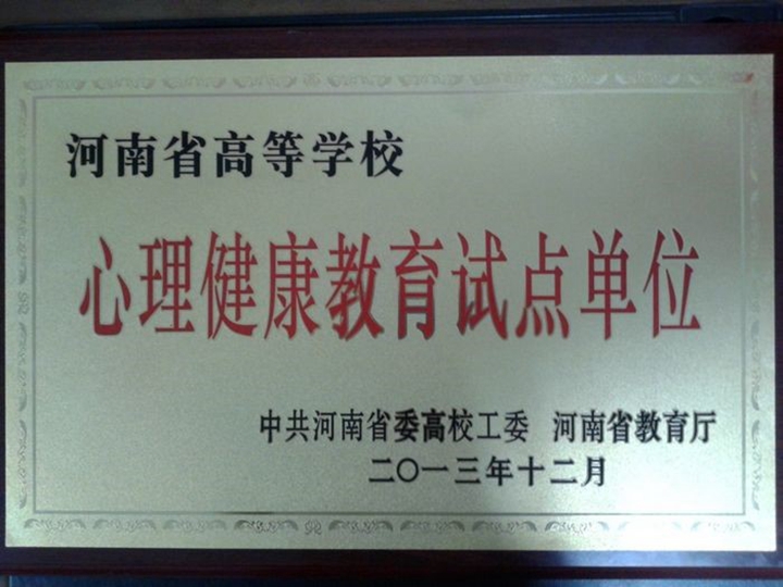 学校心理健康教育工作坚守做好学生心理健康“守门人”初心,建立健全各项规章制度,探索创新教育教学方法,打造智慧心理健康平台,着力抓好教学、活动、咨询服务和危机干预等四大体系建设,逐步形成了“四位一体、多维互动、结网授渔”的全员育心体系,成效显著。我校心理育人项目《精准滴灌“心”世界,回归初心做好学生心理健康“守门人”》入选教育部第一批高校思想政治工作精品项目,学校心理中心连续8年获得全国大学生心理健康教育工作先进集体,荣获首批“河南省高等学校心理健康教育试点单位”,《大学生心理健康教育》课程荣获“河南省本科教育线上教学优秀课程”一等奖。