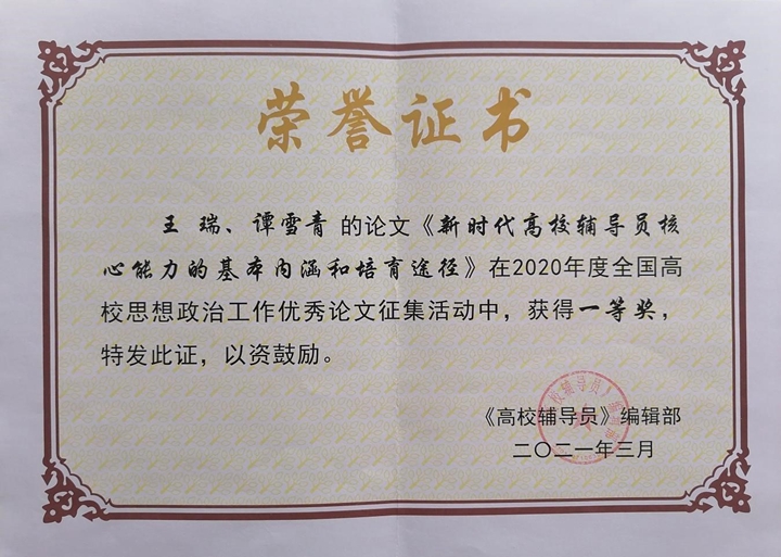 王瑞、谭雪青的《新时代高校辅导员核心能力的基本内涵和培育途径》荣获一等奖