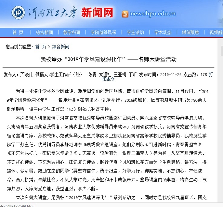 学校高度重视辅导员队伍建设,制定出台了辅导员队伍建设管理及考核办法,实施了辅导员职级聘任、职称评定等制度,并按照“点面结合、突出重点,分类指导、分层培养”原则,持续通过辅导员素质能力大赛、“一院一品”优秀学生工作品牌培育、辅导员沙龙等对辅导员进行连续性、系统化培养,不断推进辅导员队伍职业化和专业化建设,逐步形成辅导员典型培育工作机制,夯实了服务学生成长成才的队伍基础。何军等7名辅导员荣获全国高校辅导员年度人物、辅导员素质能力大赛等荣誉称号;辅导员获得100余项省级以上荣誉、品牌、项目等。