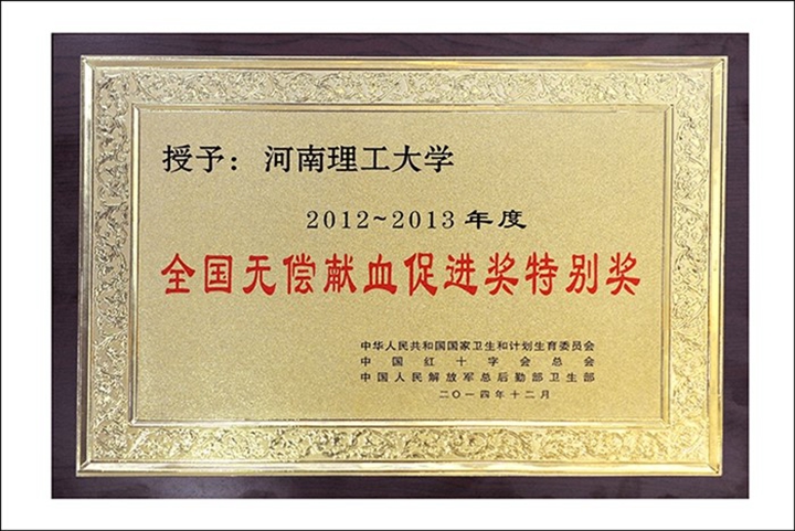 学校非常支持无偿献血进校园社会公益活动,通过设立无偿献血周、设置海报展板、开展专题讲座等形式,向广大师生宣传无偿献血政策、相关知识和注意事项,引导大家无偿献血,营造无私奉献、关爱他人的良好风尚。2014年我校荣获由国家卫计委、中国红十字会总会、总后卫生部联合评审表彰的2012-2013年度“全国无偿献血促进奖特别奖”,这是学校首次获得该项荣誉,河南省仅有四家单位获此殊荣。