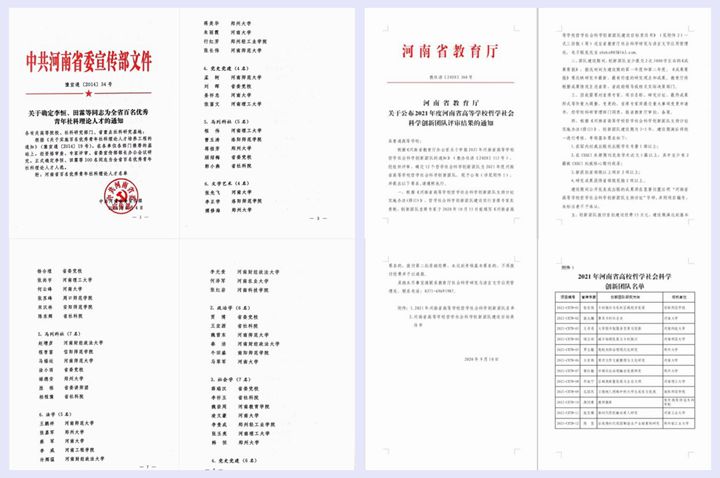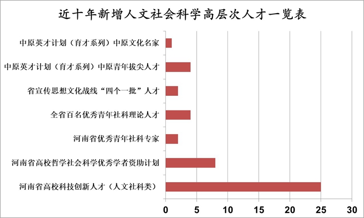 十年来,以重大项目为纽带,加强优势资源整合,坚持“人才-团队-平台”建设三位一体,设立杰出青年、高层次人才、创新团队等培育专项项目,分类分梯次筛选重点人才和团队培育对象,引导优秀人才和团队凝练方向、突出重点、强化特色,形成 “层次清晰、梯次成长、特长发展”的校-省两级人才团队培育建设体系。累计培育各类人才50余人,获中原文化名家1人、中原青年拔尖人才4人,省“四个一批”人才、省高校科技创新人才、省高校哲社优秀学者等省部级人才41人,焦作市青年社科专家等地厅级人才称号39人;培育校级创新团队10个,获批省高校哲学社会科学创新团队9个,位居全省高校前列。