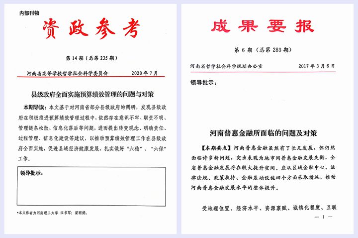 十年来,充分发挥“智囊团”和“思想库”作用,率先在全省成立高校新型智库太行发展研究院,并与原河南省政府发展研究中心、焦作市政府签订共建协议。坚持“立足河南、面向全国、推动决策、服务发展”的思路,从方向凝练、激励政策、成果产出等方面完善体制机制,智库“五个力”全面提升,先后入选河南省首批高校新型品牌智库、新型智库影响力十强名单。14项对策决策建议被省部级以上领导批示;120余项建议被相关单位采纳,其中《县级政府全面实施预算绩效管理的问题与对策》被省财政厅和审计厅采纳推广应用;累计承担决策项目51项,成果《焦作市九大产业链图谱》写入焦作市第十二次党代会报告;助力脱贫攻坚、乡村振兴等做法被《光明日报》、《河南日报》等媒体报道。