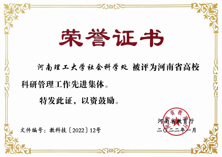 十年来,以习近平新时代中国特色社会主义思想为指导,面向加快构建哲学社会科学创新体系重大需求,支部党建和业务工作同谋划、同部署,聚焦“提升水平、凝练特色、支撑发展”主线,坚持“创新团队-重大项目-一流成果-创新平台”四位一体融合发展思路,打造五张人文社科特色品牌,建立了适应新时代要求的 “学校-学院-平台团队”三级高效协同的管理服务新机制,形成了彰显理工特色的哲学社会科学工作新模式,改革举措成效被河南日报报道。先后实现国家社科基金重点项目、省社科成果一等奖、首批高校新型品牌智库等重大突破。荣获“河南省高校社科管理先进集体”“河南省高校实施哲学社会科学繁荣计划先进单位”“全省哲学社会科学规划工作先进单位”等荣誉称号。