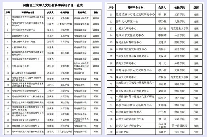 十年来,紧密围绕国家、区域和行业发展战略重大需求,以支撑学科专业建设为牵引,聚合重大项目、人才团队等各类优势资源,凝练研究方向,突出能源经济、应急管理、太极文化、生态文明等优势特色,按照点面结合、突出重点、分类实施原则,探索建立分级建设、分层管理、分类考核“学校-学院-平台”三级联动管理新机制和“小实体-大协同”平台运行新模式,平台建设组织化水平不断提高。先后获批“河南省中国特色社会主义理论体系”“安全与应急管理”“能源经济”“太极文化”“黄河流域耕地保护与城乡高质量发展”研究中心等省部级平台9个,“财税金融与区域经济研究中心”“河南省非物质文化遗产(传统体育)研究基地”等地厅级平台11个,立项建设“太极研究院”“习近平法治思想研究中心”等校级科研平台18个。