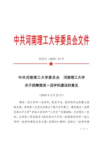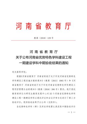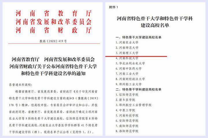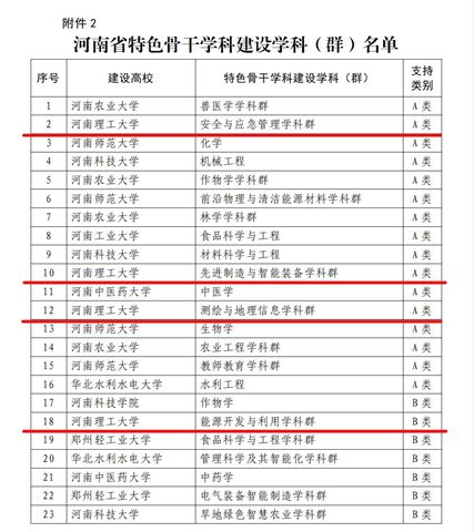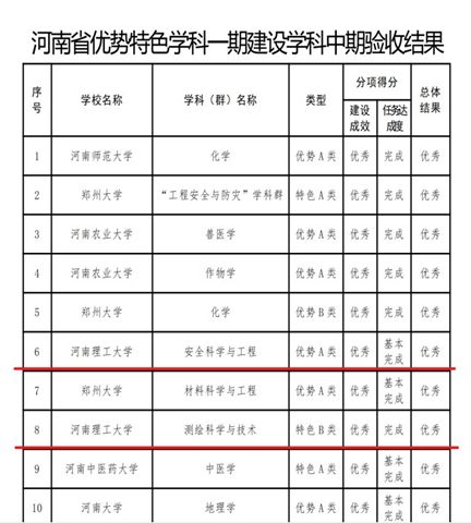 3. 入选河南省优势特色学科建设工程高校。为贯彻国务院《统筹推进世界一流大学和一流学科建设总体方案》(国发〔2015〕64号)精神,落实《河南省人民政府关于深化高等教育综合改革全面提升服务经济社会发展能力的意见》(豫政〔2015〕41号)要求,加强优势特色学科建设,加快高水平大学和特色骨干大学建设,进一步提升高等教育整体水平,河南省教育厅、财政厅2015年联合印发《河南省特色骨干大学和特色骨干学科建设方案》,学校入选河南省优势特色学科建设工程高校,安全科学与工程、测绘科学与技术2个学科分别被遴选确定为河南省A类优势学科和B类特色学科。在建设期内,安全科学与工程、测绘科学与技术2个学科在2017年全国第四轮学科评估中分别获A-、B-评价,2018年中期检查均获优秀评价,2020年顺利通过终期验收,为学校一流学科创建工作打下了坚实基础。