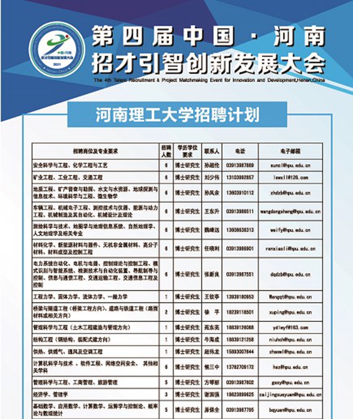 十年来,学校深入贯彻习近平总书记关于人才工作重要论述,认真落实河南省创新驱动、科教兴省、人才强省战略部署,加大高层次人才引进力度,助推学校“双一流”创建和国内一流特色高水平大学建设工作。学校积极推进校院两级人事管理体制机制改革,下放高层次人才引进自主权,不断更新和优化人才引进政策。学校积极拓展人才引进宣传渠道,依托“老家河南”和学校百年矿业高等学府品牌,通过校园网、青塔人才微信公众号、中研博硕英才网和高校人才网等网络媒体和国内知名高校专场招聘会、河南省招才引智大会等多种载体主动引才聚才。共全职引进各类高层次人才535人,其中院士1人、国家领军人才5人、高级职称12人、博士毕业院校为QS排名前500名的海外知名高校53人、国内双一流高校362人,人才引进质量大幅提高。