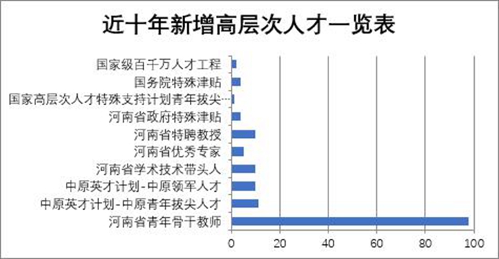 十年来,学校高度重视高层次人才队伍建设,围绕学校发展战略和学科建设需要,坚持引育并举,突出高端和重点,多渠道、多方式引进人才,分层面、分梯次培育人才。学校省部级以上高层次人才由136人增至200人,其中新增国家级百千万人才工程2人、国务院特殊津贴4人、国家高层次人才特殊支持计划青年拔尖人才1人、河南省政府特殊津贴4人、河南省特聘教授10人、河南省优秀专家5人、河南省学术技术带头人10人、中原领军人才10人、中原青年拔尖人才11人,河南省青年骨干教师98人。不断发展壮大的高层次人才队伍,为学校事业高质量发展提供了坚实的人才支撑和智力支持。