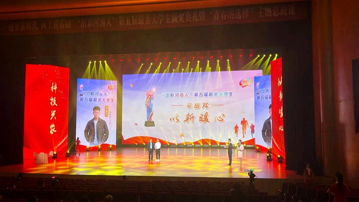 本网讯 (通讯员 王文萍 赵琨)近日,“出彩河南人”第五届最美大学生宣传推介活动结果揭晓,我校电气学院辛岳芃荣获本届“最美大学生”称号。10月14日下午,在省委宣传部、省委教育工委、省教育厅等多部门联合主办的“出彩河南人”第五届最美大学生颁奖典礼暨“青春的选择”主题思政课活动上,辛岳芃到现场领奖,音乐学院20余名师生参演节目《平凡的我们》。