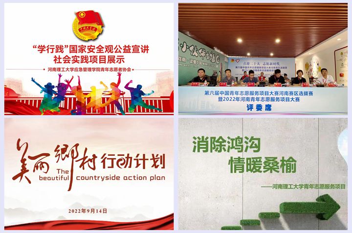 第六届中国青年志愿服务项目大赛河南省赛共有乡村振兴、环境保护、文明实践、关爱少年儿童等13个类别249个项目参赛,经过大赛组委会严格审核、初评,共有89个项目进入决赛。省赛以线上路演答辩方式进行,邀请全国青年志愿服务工作专家,主办单位、青年社会组织、专业研究机构代表、新闻媒体代表担任评委,围绕项目目标、项目成效、项目管理、项目创新、项目影响等内容对入围项目进行评审。大赛自6月份启动以来,校团委高度重视,广泛宣传,认真组织,举办了学校第十二届青年志愿服务项目大赛。经过学院推荐、现场评审、认真打磨、修改完善,学校择优推荐4个项目参加省赛。最终,经过专家评审和紧张激烈的角逐,我校建艺学院《美丽乡村行动计划》、测绘学院《消除鸿沟,情暖桑榆》、应急管理学院《“学行践”国家安全观公益宣讲实践》均获得2022年河南省青年志愿服务项目大赛银奖。
