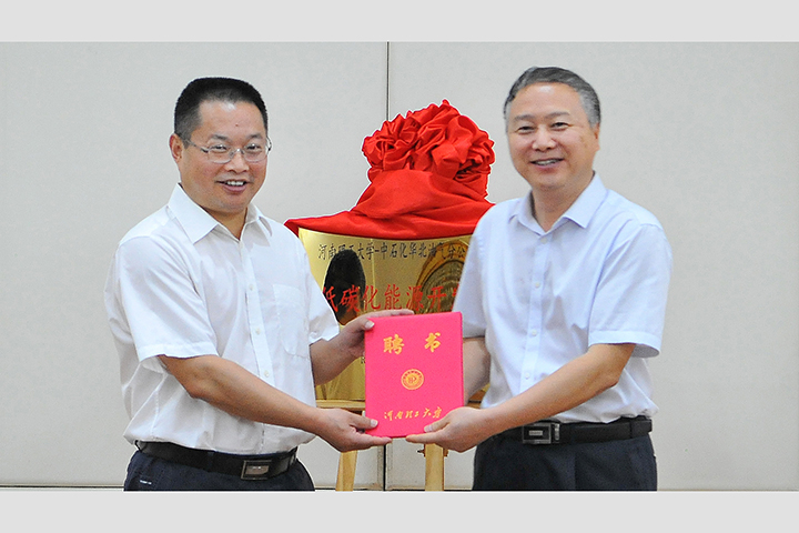 本网讯 (通讯员 王文/文 记者 李为群/图)7月2日下午,河南理工大学与中石化华北油气分公司、郑州市新郑梅久实业有限公司共建“低碳化能源开发研发中心”揭牌仪式在力行楼一楼会议室举行。副校长赵同谦、中石化华北油气分公司副总经理何发岐、郑州市新郑梅久实业有限公司总经理黄金岭出席仪式。中石化华北油气分公司相关部门负责人,我校科技处、能源学院负责人及部分教师参加了仪式。仪式由能源学院副院长李东印主持。