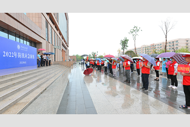 6月30日上午,天空还下着雨,学校2022年防汛应急演练在南校区第二图书馆南广场举行。校党委书记邹友峰,校防汛救灾工作指挥部指挥长、校长杨小林出席。校防汛救灾工作指挥部副指挥长、办公室主任、副校长翟耀南主持演练活动。
