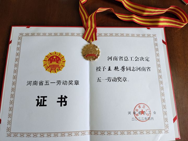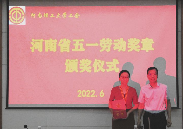 本网讯 (通讯员 谢玉芬/文 王全魁/图)6月24日下午,校工会在力行楼一楼会议室举行颁奖仪式,校工会主席郭相春为获得 2022年度河南省五一劳动奖章的我校数信学院教师王艳芳颁奖。颁奖仪式由校工会副主席田留轩主持。
