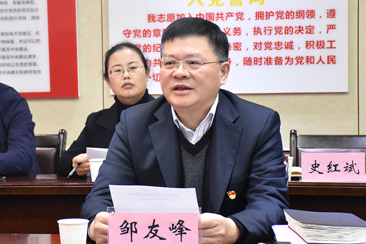 邹友峰致欢迎词。他介绍了学校及党建基本情况、党建示范创建和质量创优工作情况、首批标杆院系和样板支部培育创建情况等。邹友峰说,在全国上下深入学习贯彻党的十九届五中全会精神之际,省委高校工委组织开展首批全国党建工作“标杆院系”“样板支部”验收,既是落实全会精神的具体举措,也是对全省标杆院系、样板支部培育创建工作的一次检阅。他表示,学校党委将根据教育部、省委高校工委关于高校党建“双创”工作要求,以及专家组的意见建议,对照“六个过硬”“五个到位”“七个有力”的标准,精心谋划,强化举措,充分发挥学校党委领导核心作用、二级党组织政治核心作用、党支部战斗堡垒作用,进一步推动全校各级党组织全面进步、全面过硬。