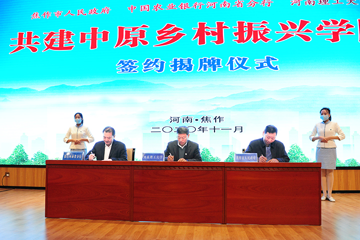 杨小林、武磊、赵予开共同签署了中原乡村振兴学院合作共建协议。协议规定,学院将围绕乡村振兴战略实施、城乡融合体制机制创新、县域经济发展、农村产权制度改革、城乡社区治理、金融服务创新等开展理论对策研究。聚焦乡村振兴人才需求,对乡(镇)村干部、返乡农村创业人员、新型职业农民、农村基层组织管理人员等开展综合素质和基本能力、宏观形势与基本理论、乡村产业与经济发展、乡村治理与基层组织建设等方面培训,组织各级各类涉农人员到乡村振兴研修基地开展实践教学与观摩学习。落实乡村振兴战略决策部署,围绕乡村建设、乡村旅游、文化旅游、民宿建设、经济发展等领域开展社会咨询服务;与地方政府、行业组织等单位共建实践教育基地,搭建校-地-企融合的一体化实践平台,实现人才培养和资源共享。