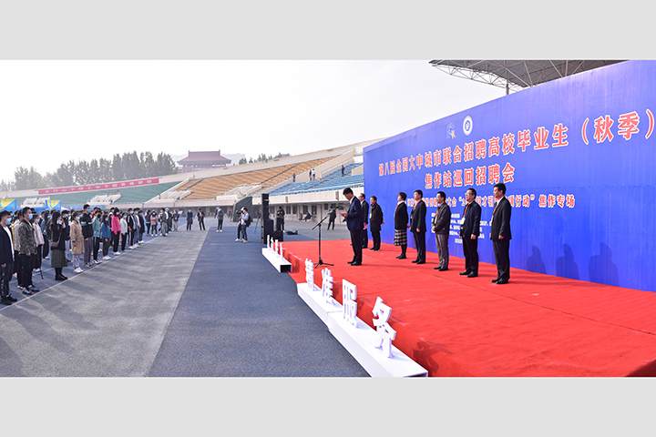 本网讯(通讯员 章陆霜 陈广龙 赵文杰/文 图片社 郑智源 栗源清/图)10月17日,第八届全国大中城市联合招聘高校毕业生焦作站巡回招聘会暨河南理工大学2020年秋季双选会、中国·河南招才引智创新发展大会“2020招才引智专项行动”焦作专场、河南毕业生就业市场焦作分市场秋季双选会在我校东体育场举行。全国人才流动中心党委副书记宋小燕、就业服务处处长李红义,河南省人才交流中心流动党委书记石敦,焦作市副市长薛志杰、市人社局局长王东林、副局长申纪平、市人才交流中心主任原军营,校长杨小林等出席活动。