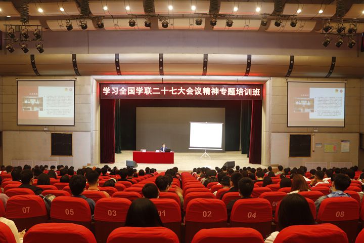 本网讯(通讯员 肖庆伦  陈璐瑶)为深入学习宣传贯彻全国学联二十七大习近平总书记贺信和党中央致词精神,全面贯彻落实全国学联二十七大提出的工作部署和任务,持续推动学生会组织深化改革,进一步落实共青团对学生会指导管理责任,10月10日,我校在南校区小礼堂举行学习全国学联二十七大会议精神专题培训班。校团委全体人员、校学生会全体成员、学院团委委员、学院学生会主席团成员、校“青马工程”学员和研究生支教团成员等300余人参加培训。