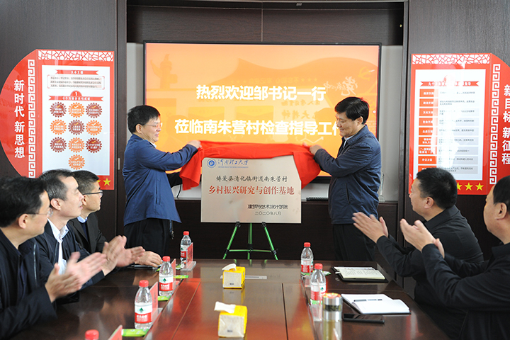 座谈会前,邹友峰和陈泓共同为建艺学院教学实践基地揭牌,副校长解伟代表学校向南朱营村贫困学生捐赠学习生活用品。