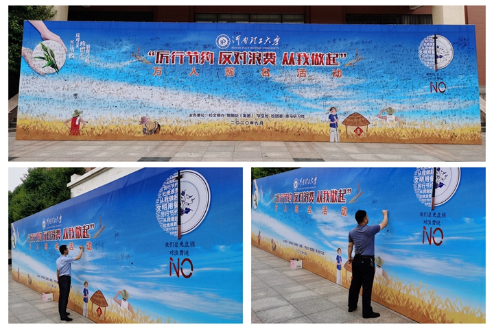 本网讯(记者 张 勐 石梦娟)为深入贯彻落实习近平总书记关于坚决制止餐饮浪费行为的重要指示精神,进一步弘扬中华民族勤俭节约的传统美德,在全校营造浪费可耻、节约为荣的良好风尚,9月24日至10月6日,学校在明德广场举行了“厉行节约 反对浪费 从我做起”万人签名活动。
