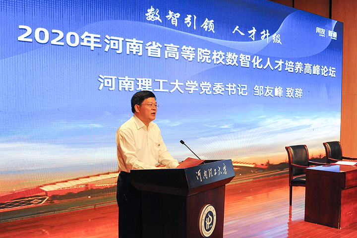 邹友峰在致辞中向参加论坛的各位领导、嘉宾和老师表示诚挚欢迎和衷心感谢。他表示,企业数智化发展对各高校人才培养提出了更高要求,高校将通过各种方式,加快智能化教学模式的改革,大力探索产教融合、协同育人。