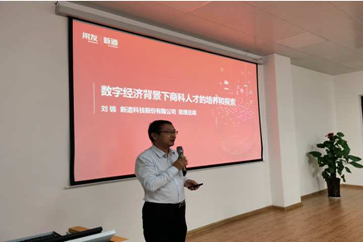 刘锦作了《数智经济背景下商科人才的培养和探索》专题报告,分享用友助力企业数智化转型的案例,以及新道科技在数智化人才培养领域的探索。刘锦结合数智化人才培养的特点,从人才培养设计、课程体系规划、师资能力赋能等方面,介绍新道的数智化人才培养路径和方法,期望校企双方共同培育创新型复合型应用型人才。