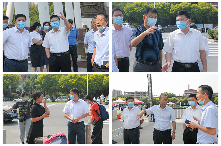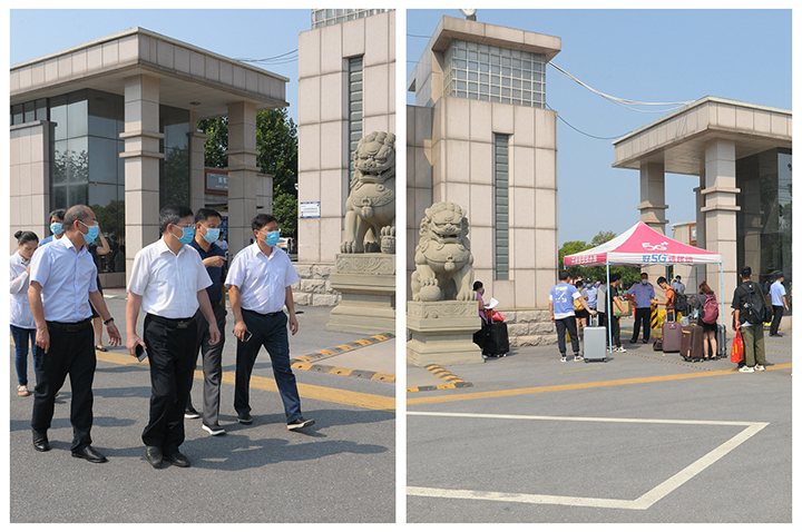 校党委书记邹友峰、校长杨小林一行在南门查看学生返校报到情况