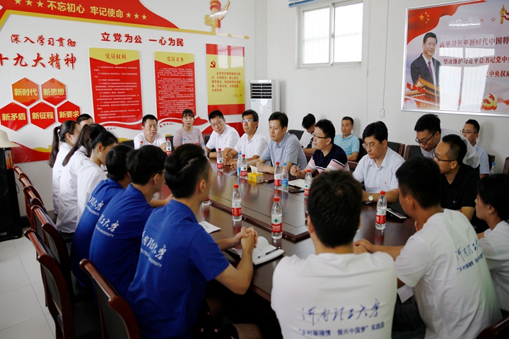 王笃波认真听取了南朱营村脱贫攻坚的工作汇报以及我校驻村干部在南朱营村的工作和生活情况。随后,实地观看了建艺学院“乡村稼穑情·振兴中国梦”团队、医学院 “杏林青年,荣耀乡村”团队、电气学院“科普大篷车”团队的活动开展情况,并与团队指导老师和社会实践队员进行了座谈。王笃波认真听取了校团委书记支光辉关于我校暑期社会实践活动工作汇报,对我校暑期“三下乡”社会实践工作给予了充分肯定并提出三点要求,一是要在社会实践中受教育。大学生要真正的走村到户,开阔视野、察国情知民情,在实践中坚定“四个自信”。二是要在社会实践中长才干。大学生要把理论和实际做好对接,知行合一,达到专业技能的提升,把所学知识转化成服务人民的本领。三是要在社会实践中感悟。大学生要有不怕吃苦的精神,到祖国和人民更需要的地方和农村第一线去实践,感悟祖国改革开放以来的重大变化。在志愿服务中不断不断提升思想境界。