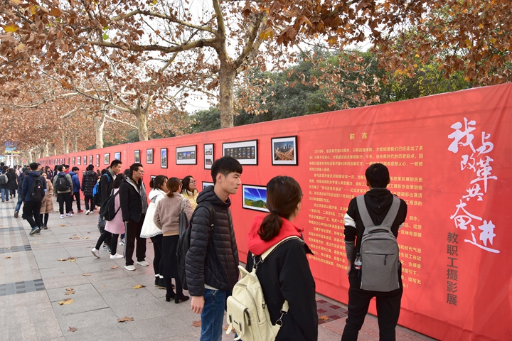 我与改革共奋进,积极建设双一流。为展示国家和学校40年改革发展的光辉进程和办学育人成绩,近日,由校工会主办,校教职工摄影协会承办的“我与改革共奋进——庆祝改革开放40周年”教职工主题摄影展在我校南校区明德广场举行。