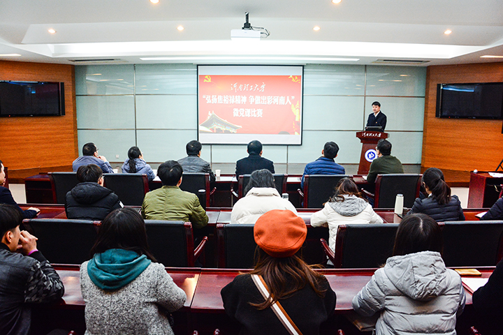 12月8日下午,我校在明德楼一楼会议室举办“弘扬焦裕禄精神,争做出彩河南人”微党课比赛活动。本次活动由党委宣传部、党委组织部联合主办,“青年马克思主义者培养工程”大学生骨干培养班20多名成员观看了比赛。来自党委办公室、党委学生工作部、党委研究生工作部和校团委等单位的6名相关负责人组成本次比赛活动的评委会。