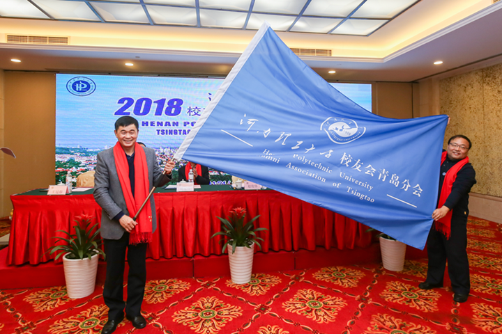 在与会校友热烈的掌声中,赵俊伟为李德锋颁授青岛校友分会会旗。
