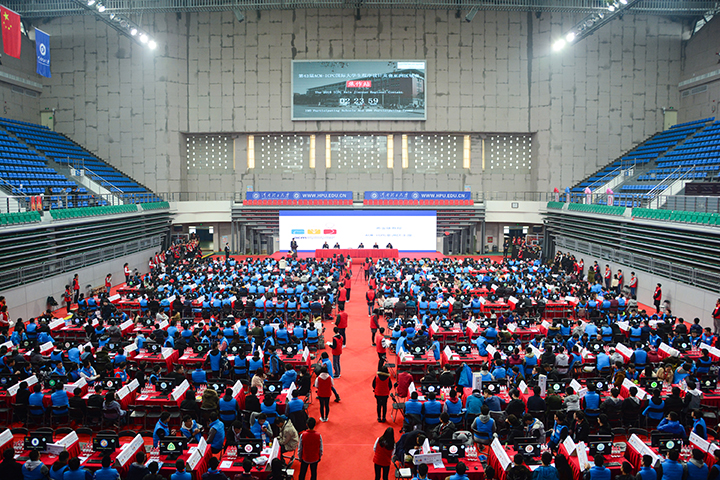 24日下午,大赛在雄壮的国歌声中拉开帷幕。大赛亚洲区域主席黄金雄、河南省计算机学会理事长周清雷、校党委副书记安士伟等出席开幕式。全体裁判员、参赛师生、学生志愿者等1400余人参加开幕式。