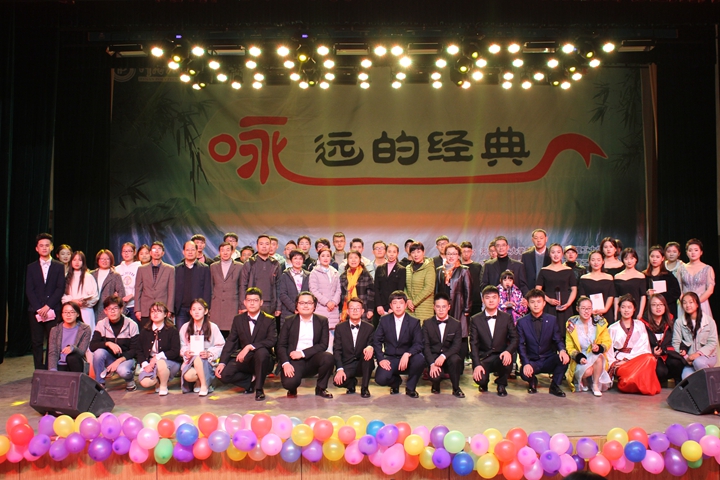 传颂经典诗篇,弘扬传统文化。为配合学校深入贯彻落实全国高校思想政治工作会议精神和全国教育大会精神,以及大力推进“三全育人”综合改革,11月11日晚,图书馆、校团委、音乐学院、文法学院主办,大学生新曦文友协会、大学生时代潮文学社承办的首届“‘咏’远的经典”传颂大赛决赛暨颁奖晚会在南校区小礼堂举行。党委常委、校工会主席翟耀南以及图书馆、校团委、音乐学院、文法学院等单位负责人参加晚会并担任评委,800余名师生共同观看了比赛。