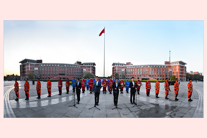 7时许,随着雄壮的《义勇军进行曲》,五星红旗在朝阳下冉冉升起,参加仪式的学生在国旗台下精神饱满,整齐列队,整个升旗仪式庄严而隆重。主题展示环节,应急学院的32名身着消防制服的学生代表进行了合颂表演,他们精神昂扬饱满,步伐整齐,原创诗歌《11·9消防日,致敬中国消防战士!》慷慨激昂、《消防赞歌》铿锵有力,让现场师生感受到了消防战士救民于水火,助民于危难,给民以力量的逆行英雄形象。
