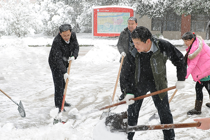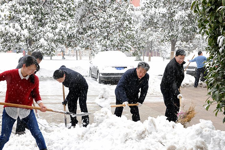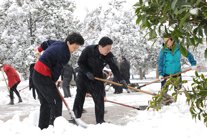 为及时清除冰雪,今天一大早,邹友峰、周志远、卫中玲、周英、张锟、赵俊伟、张尚字、解伟等校领导和广大机关干部一起,拿起铁锨、扫帚,在行政楼、明德楼、力行楼前扫的扫,铲的铲,全然不顾严寒,积极清除积雪。经过一个多小时的奋战,三栋办公楼前的积雪基本清扫干净。
