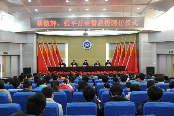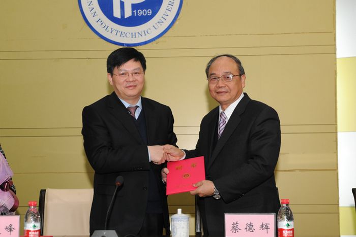 12月4日,台湾铭传大学讲座教授、台湾警察大学原校长蔡德辉先生、铭传大学教授张平吾先生一行9人莅校考察,校党委书记王少安亲切会见并设宴招待蔡德辉访问团一行。4日下午,我校在力行楼学术报告厅举行荣誉教授聘任仪式,校长邹友峰向蔡德辉博士、张平吾博士颁发河南理工大学荣誉教授聘书,仪式由副校长张锟主持。之后,蔡德辉先生以《迈向成功的理念与动力》为题向与会师生报告了他独到的走向成功的“12Q”理念,引起广泛共鸣。张平吾先生作了《台湾高等教育和大学评鉴》的学术报告,并为学生工作干部作了《拉拉舞的组织与实施》的专题报告,受到了与会师生的欢迎。