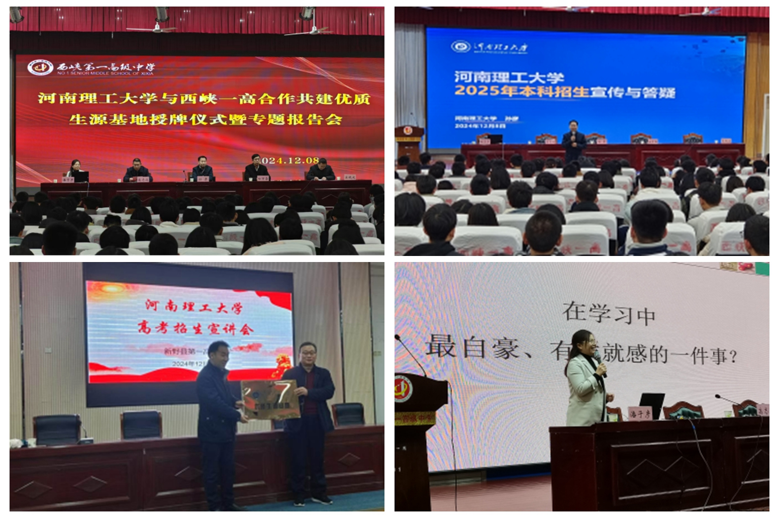 西峡第一高级中学的高志远校长、宋晓波副校长,新野第一高级中学的王飞副校长,以及新野第三高级中学的樊晓军校长、高占朝副校长分别出席了宣讲会。在每场活动的尾声,各高中的校领导均对我校的招生宣传工作表示了感谢,并进行了总结发言,强调了与河南理工大学合作的重要性,并对河南理工大学的招生政策和教育质量给予了高度评价。