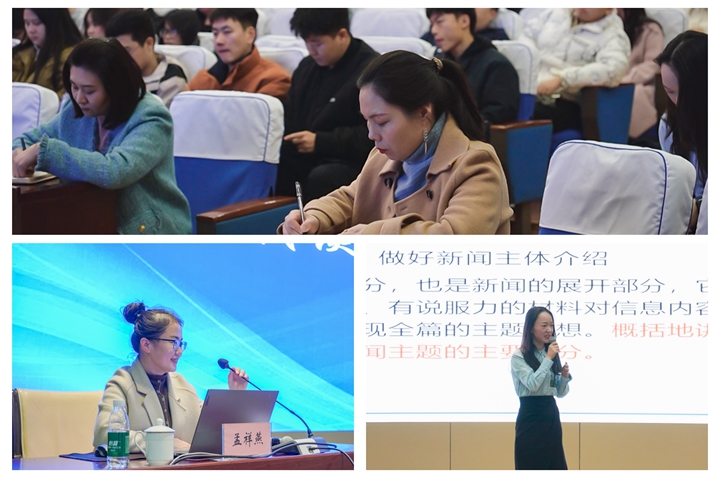 宣传部新闻宣传科、新媒体管理科负责同志苏丽敏、孟祥燕分别以《如何写好“校园新闻”》《浅谈融媒体作品创作》为题作专题讲座。详细介绍了新闻写作规范,学校融媒体建设的基本情况,讲授了提升新闻写作能力的方法、融媒体作品的创作策略及注意事项。期间,参会学生与老师积极互动,培训现场气氛热烈。