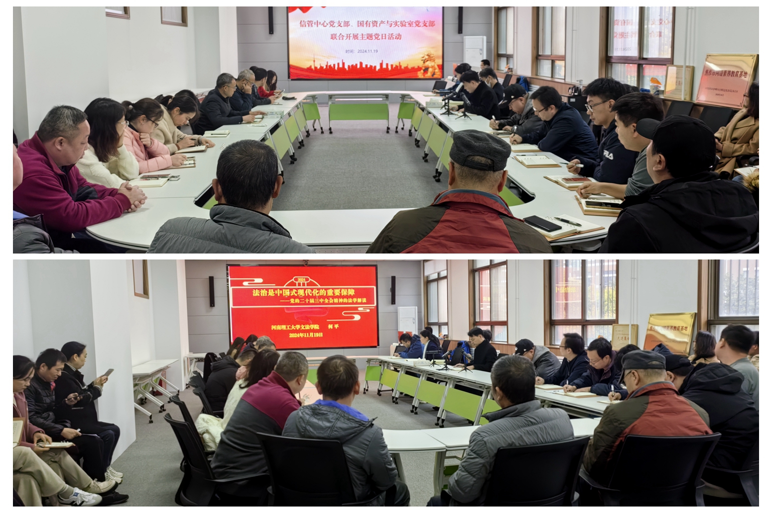 为深入学习贯彻习近平法治思想,及时更新干部职工法律法规知识储备,进一步提升法治意识,11月19日上午,信管中心和国有资产与实验室管理处党支部联合邀请文法学院博士何平作专题宣讲报告,两个支部共计50余人参加了报告会。报告会由信管中心主任彭维平主持。