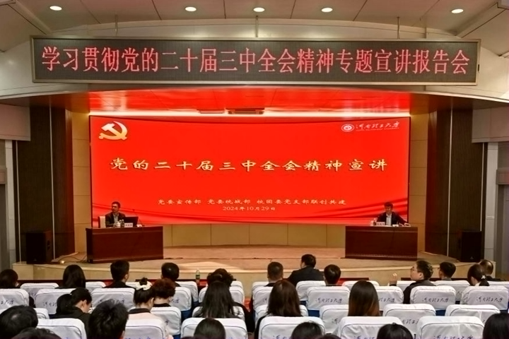 为深入学习贯彻党的二十届三中全会精神,准确把握中国式现代化的核心特征,10月29日下午,校团委党支部在学术报告厅举行学习贯彻党的二十届三中全会精神宣讲报告会,邀请学校理论宣讲团专家王家涛老师作《学习党的二十届三中全会精神 开放是中国式现代化的鲜明标识》专题报告。校团委全体教职工、研究生支教团以及第十四期“青马工程”培养班成员参加报告会,报告会由校团委书记支光辉主持。