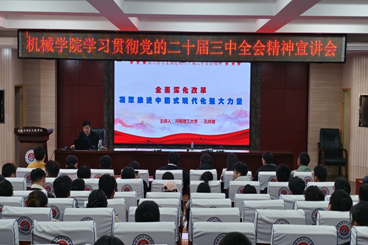 为深刻认识党的二十届三中全会的重大意义,深入领会党的二十届三中全会提出的重要思想、重大论断、重点部署,准确把握进一步全面深化改革的主题、重大原则、重大举措、根本保证,10月22日,机械学院邀请校理论宣讲团专家、马克思主义学院副教授孔祥增为全体教工和学生干部做了题为《全面深化改革—凝聚推进中国式现代化强大力量》的宣讲会。