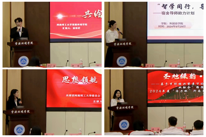 本网讯(通讯员 李智慧)为全面学习贯彻习近平新时代中国特色社会主义思想,深入贯彻落实党的二十大和二十届三中全会精神,认真贯彻落实习近平总书记在同团中央新一届领导班子集体谈话时的重要讲话精神和五四重要寄语精神,落实省委十一届七次全会精神和团十九大工作部署,持续巩固和深化“全团抓思想政治引领”“全团大抓基层”“全团抓学校”的改革方向和建设成果,9月29日,由校团委主办、资环学院团委承办的河南理工大学2024年度“活力杯”共青团基层基础工作大赛决赛在资环学院一楼第一学术报告厅举行,校党委宣传部、校团委、学生处相关负责人担任评委出席。