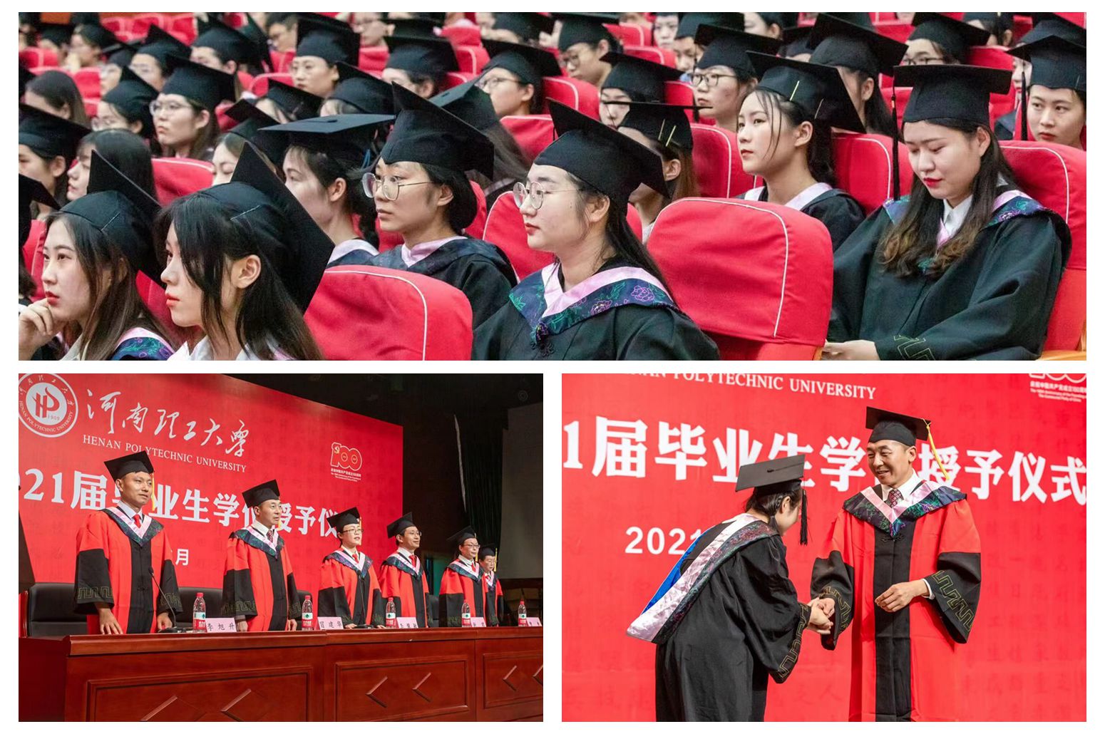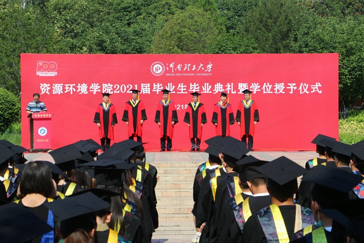 典礼在庄严的国歌声中拉开序幕,随后该院副院长马安平宣读关于授予毕业生毕业证的决定,宣读河南省教育厅、河南理工大学关于表彰2021届优秀毕业生的决定。该院副院长孙娟宣读河南理工大学学位评定委员会关于授予2021届毕业生硕士学位和学士学士的决定。该院领导为省级优秀毕业生、校级优秀毕业生、孙越崎学生奖学金获得者、考研优秀学生代表颁发了荣誉证书。