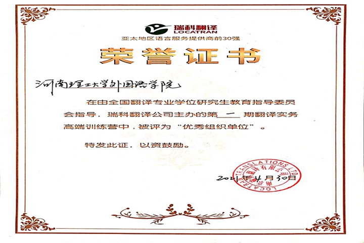 本网讯(通讯员 冉玉体 李治民)为深入推进党史学习教育,扎实开展“我为师生办实事”实践活动。本学期,外国语学院多方协调、积极组织翻译专业研究生参加由全国翻译专业学位研究生教育指导委员指导,南京瑞科翻译公司主办的全国第一期翻译实务高端训练营,并获“优秀组织奖”。