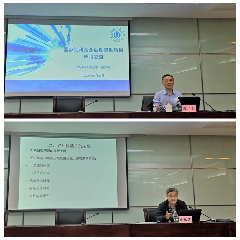 本网讯(通讯员 周春晓)为深入推进党史学习教育,进一步落实学校“我为师生办实事”实践活动要求,高标准高质量完成学习教育各项任务,进一步提升我校人文社会科学研究项目申报质量,提高项目资助率,5月17日上午,社科处邀请郑州轻工业大学社科管理处处长周广亮教授、中原工学院社会科学处处长周纪昌教授作项目申报辅导报告,报告会在明德楼一楼会议室举行,会议由社科处处长张合兵主持。相关学院科研副院长、科研秘书及教师参加辅导报告会。