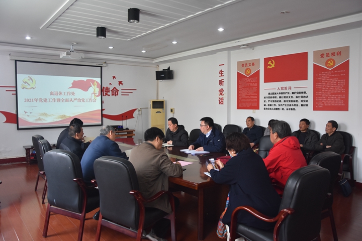 3月25日上午,离退休工作处党委在北校区离退休职工活动中心三楼会议室召开2021年党建工作会暨全面从严治党工作会议,学习传达学校2021年全面从严治党工作会议精神,回顾总结2020年度离退休工作处党建工作,安排部署2021年党建工作任务。会议由离退休工作处处长杨可臣主持,处领导班子成员、党委委员、离退休职工党支部书记和在职职工党员参加会议。