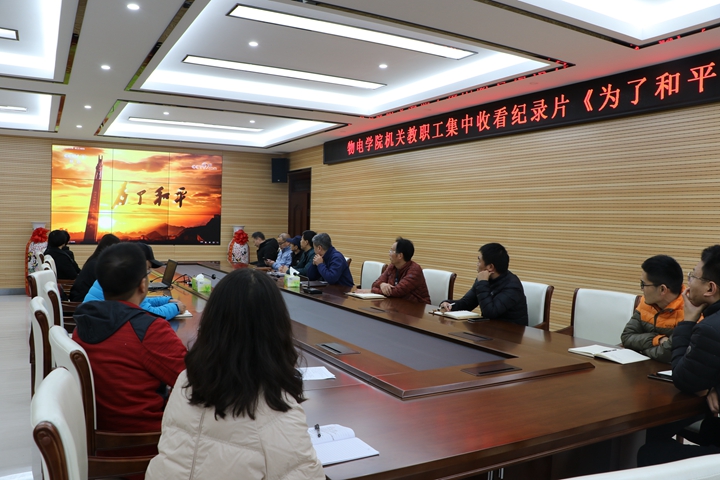 为大力弘扬伟大的抗美援朝精神,加强新时代爱国主义教育,物电学院深入推进“四史”学习教育活动,将组织观看《为了和平》大型电视纪录片作为广大教职工思想政治教育的重要内容和有力抓手,通过开展教育活动,让教职工更好担当起学生健康成长指导者和引路人的责任。