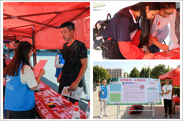 本次宣传活动以“文明旅游,从我做起”为主题,充分利用微博、微信、QQ等新媒体,通过网络广泛宣传发动。活动现场开展了知识宣讲、法律咨询,发放了宣传材料,举办了有奖竞答游戏,并组织了文明旅游承诺签名。现场宣讲环节,工作人员宣读了旅游知识、安全常识、旅游法规与公约等,引导师生深入了解旅游文化,主动维护旅游秩序,自觉做到文明旅游。现场咨询服务环节,帮助同学们解答了有关旅游权益保障、旅游公共服务、旅游市场规范、出入境非法滞留、与旅行社签订合同注意事项等方面的问题。有奖竞答游戏中,采取随机抽题答题的方式,使同学们在参与游戏过程中学习了旅游相关知识并有精美礼品相送,吸引同学们纷纷驻足观看,现场气氛活跃。文明旅游承诺签名活动中,大家认真阅读了全国文明旅游公约“重安全,讲礼仪;不喧哗,杜陋习;守良俗,明事理;爱环境,护古迹;文明行,最得体”的内容,并在条幅上签名留下“文明旅游”的庄重承诺。工商学院党委书记黄定国认为,目前我国旅游业发展很快前景很好,但游客不了解文明公约不遵守景区管理的行为时有发生,目前双节来临,在校内开展文明旅游宣传活动对于广大师生在假期愉快出行具有积极意义。