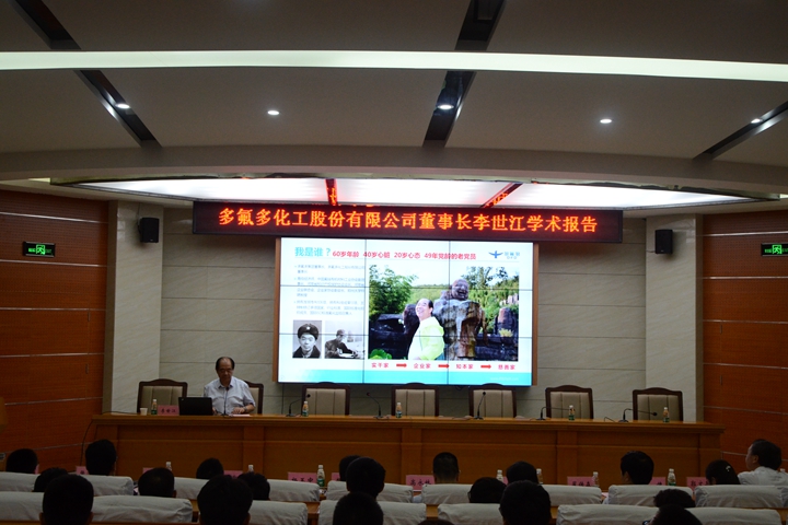 在讲座中,李世江首先介绍了自己从实干家、企业家到知本家、慈善家的个人奋斗经历,随后他从公司对于“氟、锂、硅”三元素的研究和探索三元素在电化学领域的应用方面出发,介绍了公司在氟化工领域的创新发展,打破外国对于氟化工技术的垄断,立足国家氟化工行业领军地位的发展历程,以及公司从氟化工出发,向新能源进军,致力于新能源汽车的研究,以“氟通四海,硅达五洲,锂行天下,车载未来”为目标的发展规划。