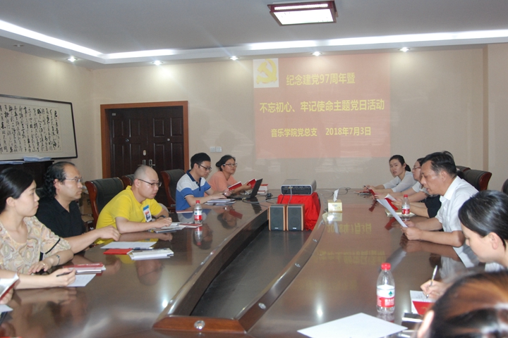 为学习贯彻落实学校第二次党代会精神,音乐学院于7月3日下午在该院会议室开展了纪念建党97周年暨“不忘初心、牢记使命”主题活动。该院党总支书记杨玉海,副院长孙娟,全体师生党员共同参加了活动。